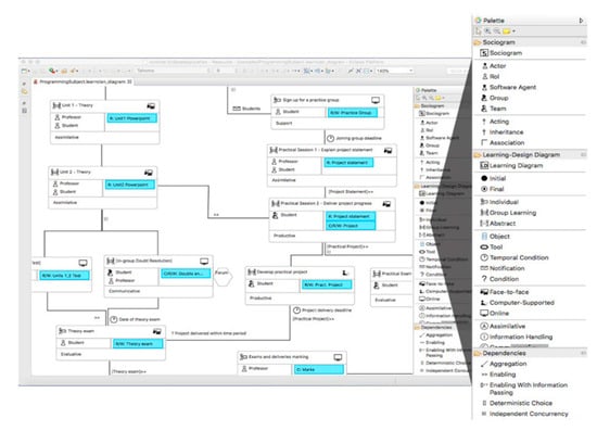 - Molina, A.I.; Arroyo, Y.; Lacave, C.; Redondo, M.A. Learn-CIAN: A visual language for the modelling of group learning processes. Br. J. Educ. Technol. 2018, 49, 1096–1112. [Google Scholar] [CrossRef]