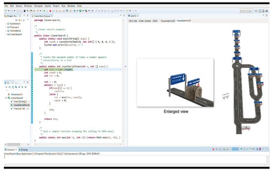 COLLECE (COLLaborative Edition, Compilation and Execution of programs) [28] is another 100% collaborative teaching environment (Figure 11) implemented on top of the Eclipse IDE. It is complemented by a notation (ANGELA, notAtioN of road siGns to facilitatE the Learning of progrAmming) [29] that allows the visualization (Figure 12) of algorithms through a metaphor of roads and signals, which in turn allows its use to teach programming in the early stages of the students’ training. It is important to note that it can not only be utilized to teach programming, but also in peer programming environments. In addition, it encourages the creation of groups of programmers collaborating to solve complex problems.