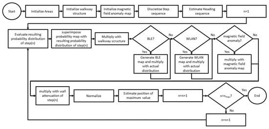 The procedure of superimposing the probability distribution map () with the current step distribution () represents the prediction step. In contrast, the Hadamard products (element-wise multiplications ) of this result with the maps of walkway structure (), BLE (), WLAN (), and of the magnetic field anomalies (), as well as of the weakening of implausible areas () corresponds to the importance sampling or update step in the classical PF approach.