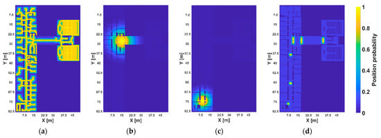 These calculations and the normalization are repeated recursively for each step. Therefore, the current position is determined from each previous position estimate and the current sensor data. This process and the respective probability distributions are shown in Figure 5b–d after 2, 5, and 20 steps. Furthermore, the video “S1 Extended Localization” of the Supplementary Materials illustrates the step-by-step positioning determination.