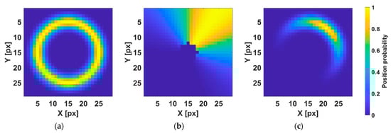 Pedestrian dead reckoning maps: (a) ring of the step size distribution; (b) heading estimation; (c) resulting probability distribution of one step.