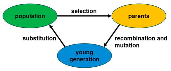 In the context of this work, the (μ, λ)-strategy (μ—parents and λ—children) is pursued [], and as in biological evolution, a limited lifespan of individuals [] is used. The maximum age of an individual is of the number of generations and the population size is kept constant in every generation.
