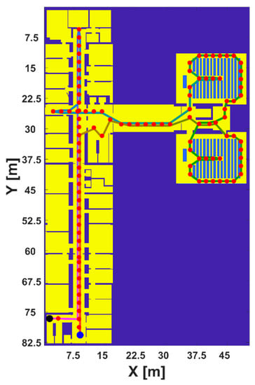 The walkway structure (Figure 3a) is an assumption of the paths in a building based on the skeletonization of the walkable indoor area. This map’s highest values (yellow cells) represent areas with a high distance to the walls nearby inside the building.