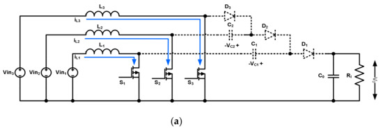 Mode 1, ∆t1 (see Figure 1a): This mode starts by turning on switches S1, S2 and S3 at the same timeframe; diodes D1, D2 and D3 are state–off. In this interval, inductors L1, L2 and L3 are charged by Vin1, Vin2 and Vin3, respectively. Currents IL1, IL2 and IL3 increase linearly from its minimum value to its maximum. Considering that the average currents through capacitor C1, C2 and Co are zero, voltages VC1, VC2 and VCo are constant. This mode ends when switch S2 is turned off at ∆t2.
