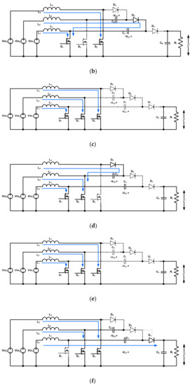 Mode 6, ∆t6 (see Figure 1f). In this mode, S1 is turned off, and D1 is activated, allowing the current of inductor L1 flows through C1 and Co. Hence IL1 decreases linearly and begins to charge Co; at the same timeframe, C1 is discharged to RL. This mode ends when switch S1 is gated ON.