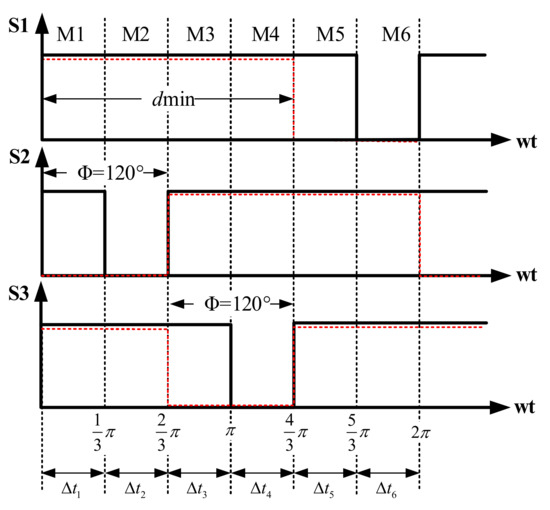 The six operating modes are shown in Figure 1. The control signals that generate these modes (M1 to M6) are presented in Figure 2. The control signals for dmin are indicated in red; it can be observed that, at any timeframe, there are two switches in conduction, at most.