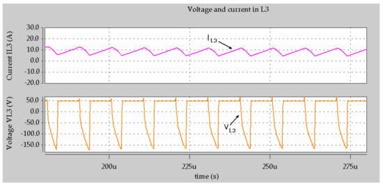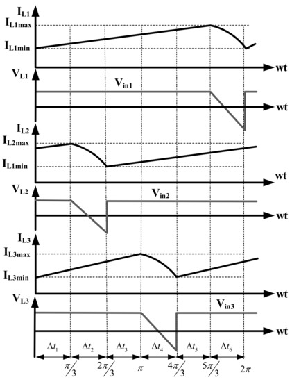 In Figure 12, voltage and current waveforms of inductors L1, L2 and L3 are shown. Positive amplitudes in voltage waveforms are approximately equal to the value of the corresponding input voltage supply. A comparison of these waveforms with the ideal waveforms of Figure 3 and Figure 5, Figure 6, Figure 7, Figure 8 shows their similarity, validating the experimental results. Spikes and high-amplitude ripples observed in the experimental waveforms show the existence of parasitic components that are not considered in simulation.