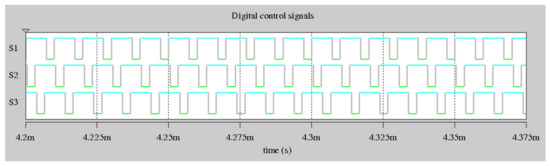 Control signals S1, S2 and S3 are shown in Figure 4 with a phase shift φ = 120° and d = 0.72 The voltages VL1, VL2 and VL3 and currents IL1, IL2 and IL3 are shown in Figure 5, Figure 6 and Figure 7, respectively. They can be contrasted with the ideal waveforms of Figure 3 to verify the correct operation of the converter.