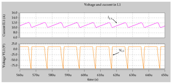 Using Equations (10)–(13), the final component values are obtained and listed in Table 2, together with the design conditions. A simulation was performed in Saber™ using ideal components to validate the design procedure and the correct operation of the three-input step-up converter.