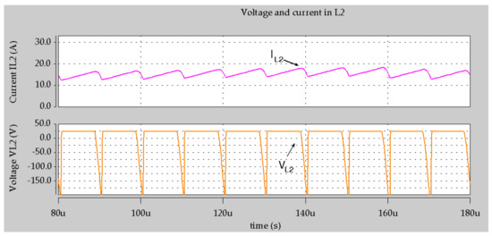 Mode 2, ∆t2 (see Figure 1b). In this mode, S2 is turned off, and D2 is activated, allowing current of inductor L2 flows through C1 and C2. Thus, IL2 decreases linearly and charges C1 and C2, increasing their voltages. This mode ends when switch S2 is turned on at ∆t3.