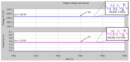 Simulation results for output voltage and current, Vo and Io are shown in Figure 8 with DC (average) values VODC = 193.39 V and IODC = 5.52 A, getting an output power of Po = 1.067 kW. The ripple voltage obtained ΔVo = 951 mV.