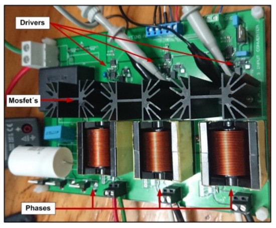 Considering that the maximum drain-source voltage is the output voltage, SiC transistors CMF20120 and diodes C3 D06060 were employed to reduce switching losses in the implemented prototype. The NXP TWR−KV 58 F220 microcontroller was used to generate the PWM pulses with a phase shifted of 120°. Inductors were designed and constructed, following the methodology presented in [14].