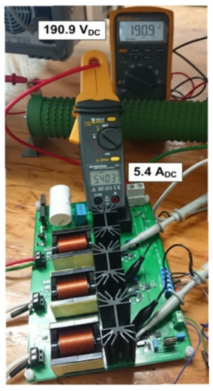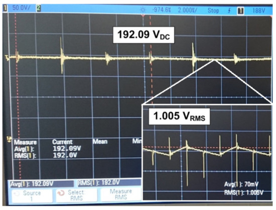 The implemented prototype can be seen in Figure 9, where the main components are indicated. Output voltage and current are shown in Figure 10; obtained multimeter measurements are 190.9 VDC and 5.4 ADC. In Figure 11, it can be seen that the output voltage is 192.09 VDC, with ripple voltage of 1.005 VRMS, resulting in an output power of Po = 1.037 kW.