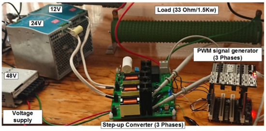 A comparison between the proposed converter and similar topologies is summarized in Table 3. The implemented converter provides the highest output power, keeping a high efficiency, considering three voltage sources in its design. The number of energy storage elements is less than the converters proposed in [9,10,11,12,15,16]. The high switching frequency (100 kHz) is a factor to reduce its implementation size.