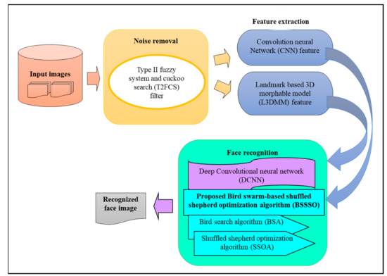 Initially, the input image undergoes a noise removal phase to eliminate noise to make them suitable for subsequent processing. The noise removal is performed using T2FCS [22], which helps to detect noisy pixels from the image for improved processing. After the noise removal phase, the feature extraction is carried out using the convolution neural network (CNN) model and L3DMM [23]. Here, the CNN is a multi-layered neural network with a special architecture for detecting the complex features in the data and the L3DMM feature is utilized to fit a 3D face from the single uncontrolled image. The obtained features are subjected to Deep CNN for face recognition. The training of the deep neural network is performed using the bird search-based shuffled shepherd optimization algorithm (BSSSO). Here, the proposed BSSSO is designed by combining the shuffled shepherd optimization algorithm (SSOA) [16] and bird swarm algorithm (BSA) [17] for training Deep CNN.