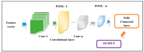 The architecture of the Deep CNN is deliberated in Figure 2 and the architecture of DCNN comprises three layers: pooling (POOL), convolutional (conv), and the Full Connected (FC) layers. Among the three layers of DCNN, each constitutes a specific function. The main function of the conv layers is to generate feature maps from segments of pre-processed images and these feature maps are sub-sampled down in pool layers. The third layer is the FC layer, where the classification is progressed. The convolutional layer engages in mapping the input such that the input maps undergo convolution with the convolutional kernels in order to develop the output map. The size of the output map is similar to the kernel number and the kernel matrix dimension is . Hence, this makes it clear that the conv layers are the multilayer input maps loop, output maps, and kernel weights. In the first conv layer, there are several inputs and outputs, whose size reduces in the successive conv layers such that classification accuracy of the objects depends on the layers in the Deep CNN.