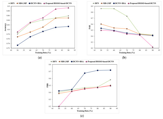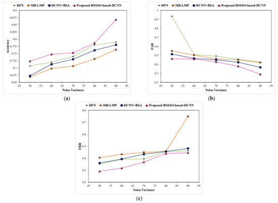 The proposed BSSSO-based-DCNN is tested on the LFW dataset [24] under the different amounts of training data and varying noise. Figure 7 illustrates the performance of the proposed BSSSO-based-DCNN and other traditional methods, namely, DFN, MB-LMP, and DCNN+BSA in terms of accuracy, FAR, and FRR under the different percentages of training data. It can be observed that the proposed BSSSO-based DCNN outperforms other traditional methods in all settings for training data ranging from 50% to 90%. It shows the maximum accuracy, minimum FAR and FRR. Considering a particular case when training data is 90%, the false accepts was reduced to 50% i.e., 0.2190 when compared with other methods (Figure 7b). The statistical data presented in Figure 7a–c indicate that our proposed BSSSO-based DCNN has achieved state-of-the-art results on the LFW dataset under different amounts of training data.
