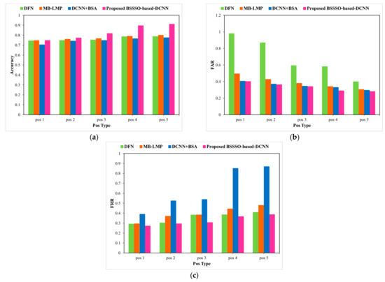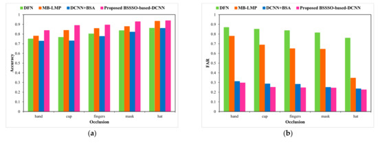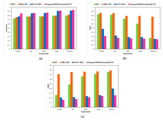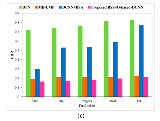Next, the UMB-DB database is used to evaluate the performance of the proposed BSSSO-based Deep CNN under expression and occlusion variations. Figure 9 and Figure 10 depict an analysis of the proposed method using the UMB-DB database by varying the expressions and occlusions, respectively, in terms of accuracy, FAR, and FRR. A significant improvement in accuracy is depicted. The expressions considered are normal, sad, smile, angry, and hate; a significant drop in the false accepts and false rejects is also achieved by the proposed BSSSO-based Deep CNN. For a particular case, when the expression is sad, the false rejects dropped by 0.80 for the proposed BSSSO-based Deep CNN in comparison to BSA + DCNN. Figure 10 portrays the improvement of the proposed method using the UMB-DB database by varying the occlusion. Figure 10a–c portray the analysis of accuracy, FRR, and FAR, respectively, with respect to different occlusion like finger, cup, hand (in front of the face image), mask, hat (on the face). Better accuracy, reduced FAR, and reduced FRR demonstrate that the novel BSSSO-based Deep CNN is robust to expression and occlusion variations.