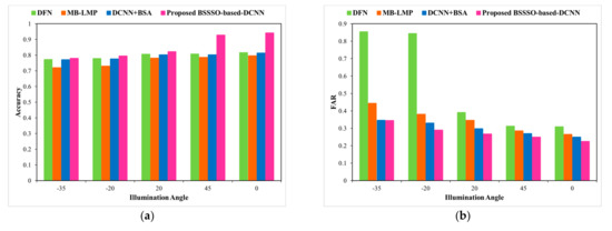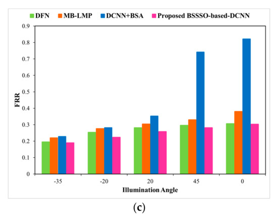 We evaluate our model on the Extended Yale B database by illumination and pose variations. Figure 11a–c portray the accuracy, FAR, and FRR, respectively, for the developed method and the traditional methods for different illumination angles. When the illumination angle is 45, the proposed algorithm shows an improved +1.15 accuracy in terms of relative performance when compared with BSA + DCNN.