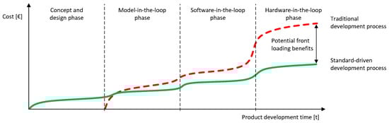 Figure 1 sketches the expected cost for simulation-driven development of CPS over time. It considers four different phases of system development as frequently seen in industry. During the concept and design phase the system’s main characteristics, purpose, functional description, as well as potential hazards and risks to that functionality are defined. During the model-in-the-loop (MiL) phase, a functional simulation model of the system under development is created and tested under simulation conditions. During the software-in-the-loop (SiL) phase, target platform specific code is used for test under simulated conditions. During the hardware-in-the-loop (HiL) phase, a prototype or final sample of the system is tested under simulated conditions. Dependent on the context of product development, a fifth phase may be present. It covers the final product or a series production prototype in its intended real-world environment, or an environment that comes close to that. A typical example thereof is vehicle-in-the-loop testing.