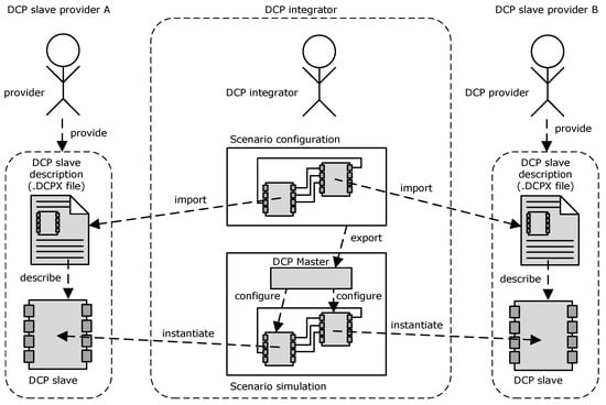 The DCP specification includes a non-mandatory integration methodology ([4], Section 10-B). It is shown in Figure 4. This default integration methodology is not a process description. Instead, it highlights the relationships between the most important DCP related artifacts. ProMECoS supports this integration methodology. The integration methodology is based on two fundamental roles, namely the “DCP slave provider” and the “DCP integrator”. As its name suggests, the slave provider is responsible for provision of a slave and its associated description to the integrator. A DCP slave is either a simulation model or a real-time system on a ready-to-run execution platform that is accessible via DCP over a given supported communication medium ([4], Section 3.1.3). The integrator’s tasks are related to import (see Section 2.3.2, ProMECoS Task 1.7), instantiation (see Section 2.4.5, ProMECoS Tasks 2.1, 2.2, 2.3), configuration (see Section 2.3.4, ProMECoS Task 1.10), and operation (see Section 2.3.5, ProMECoS Tasks 3.1–3.4) of at least one slave in a co-simulation scenario.