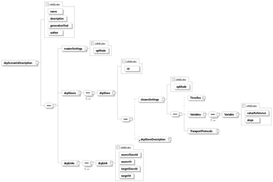 A distributed co-simulation scenario is defined as the structural integration of multiple slaves to perform a common simulation task. Since the DCP file contains only information about one single slave, a data structure for representation of such scenarios is needed. For DCP, such a description file in terms of an XML schema description was proposed in [31]. Figure 5 shows the structure of this schema, including elements, groups and attributes.
