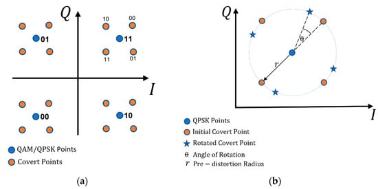 The carrier constellation is marked with blue circles, while the constellation related to the covert subsymbols (i.e., covert message bits) is marked with red ones. The probability of detection by adversaries is limited by reducing the predistortion radius, r. In addition, r can be changed (e.g., randomly) within a preset range. A. Dutta et al. for masking purposes used the fact that the QAM signal is transmitted by using the OFDM []. Therefore, each unused OFDM subcarrier may be a masking element providing more random (noiselike) in relation to the general character of the covert transmission. Additionally, A. Dutta et al. propose inserting angle rotation, θ, for successive OFDM harmonics, to increase the number of the received QAM constellation states for the subcarrier set. However, it does not change the number of constellation points if only one of the OFDM subcarriers is analyzed.