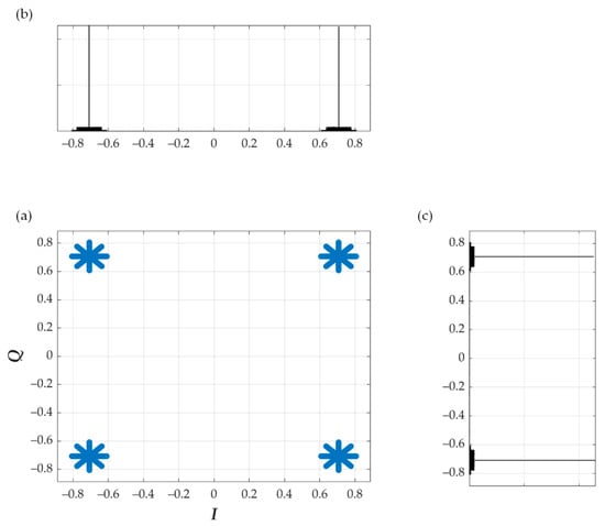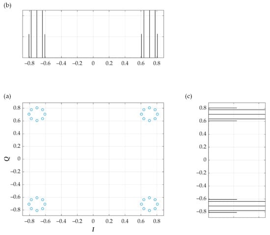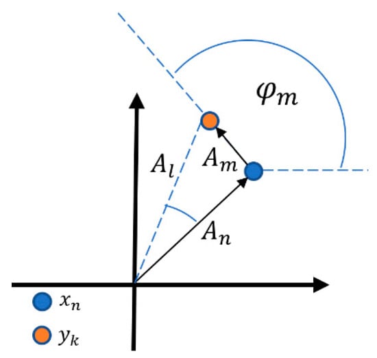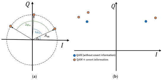 where and mean the amplitude and phase of the new point in the constellation relative to the origin of the IQ coordinate system, respectively, which is depicted in Figure 3.