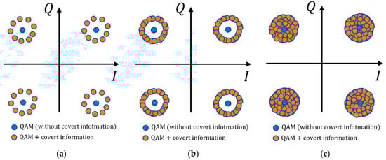 Constellations of carrier and the covert channels applied with: (a) fixed initial phase φx; (b) random φx; and (c) random φx and Am.