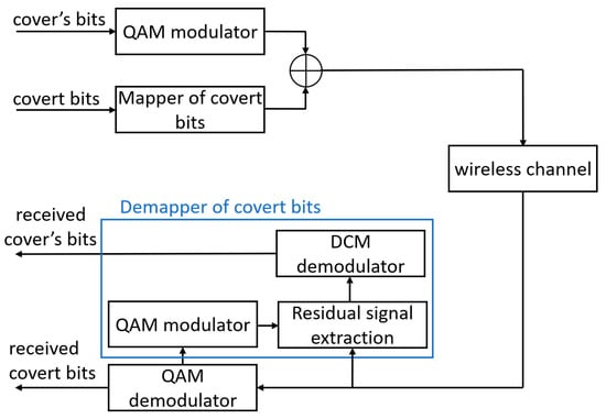 In the receiver system, if necessary, the detection of the overt signal (cover) is performed using a traditional QAM demodulator. By contrast, information from the covert channel is received by using the so-called DCM demapper. In the first instance, this system determines the residual signal, which is the difference between the constellation points of the carrier and the received signal, In more detail, it is an assigned complex vector with error caused by the signal transmission through the radio channel
