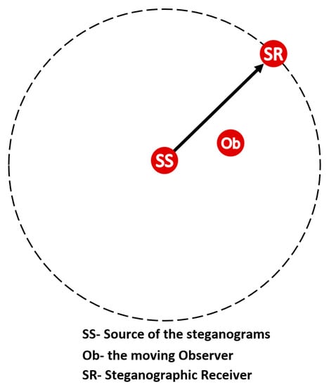 Instead of determining the statistical values of the signal at the receiver input by using the classic prisoner problem proposed by Simmons [] we may use the scheme of a moving observer [] to assess the detection. In this model, Alice, Wendy, and Bob correspond to the steganographic source (SS), observer (Ob), and steganographic receiver (SR), respectively. Figure 6 illustrates the analyzed scenario.