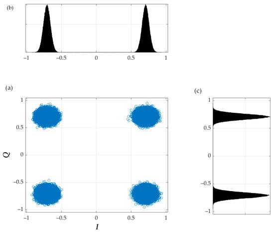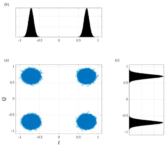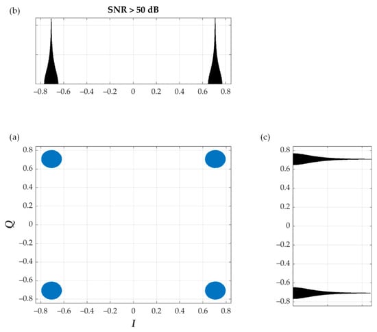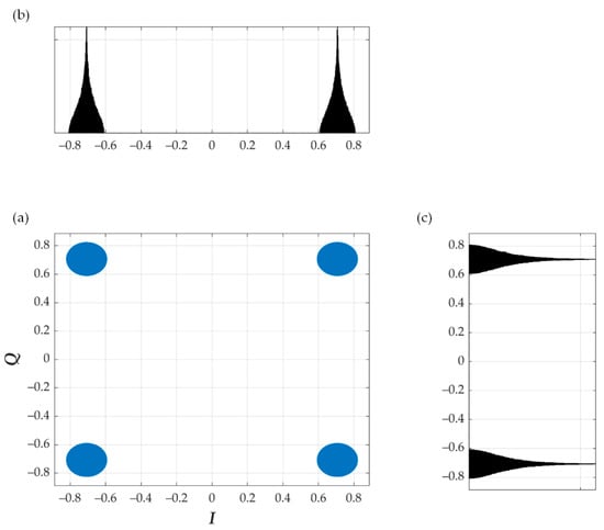 (a) Constellation, (b) in-phase and (c) quadrature histogram for SNR > 50 dB, K = 30, random Am, and EVM = 3%.