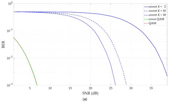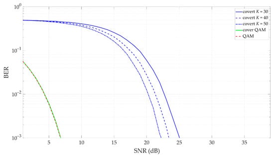 Introducing random reduces the level of energy per symbol of transmitted covert information, which means that it is necessary to increase the number of averages to provide the assumed BER level. An example for such a case (i.e., random ) was presented in Figure 13, Figure 14, Figure 15 and Figure 16. The cover is provided by 4 QAM, and . In Figure 13, we show BER versus SNR for different K and EVM = 3%. Figure 14 illustrates EVM versus SNR for the carrier signal and covert channel (), whereas Figure 15 and Figure 16 depict the constellations and histograms for EVM = 3%, SNR > 50 dB and SNR = 38 dB, respectively.