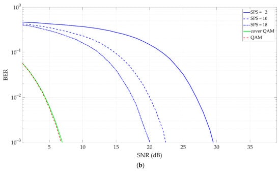 Based on simulation studies, we compared our solution with the dirty constellation method presented in []. In this case, we assumed that the number of averaging in the DCM modulator corresponds to the number of covert symbols per carrier symbol (SPS) in [], the cover is the 4 QAM signal, and . For easier comparison, we additionally assumed that the centroid distance and the radius of covert information dispersion in [] remain constant. Figure 12 depicts the obtained comparison results of the transmission capabilities of the covert channels and the effect of the covert channels on the carrier QAM signals for EVM = 3%.