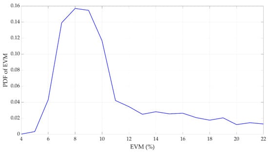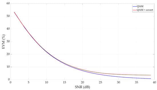 The limit values of the cost function are usually defined for a given cover transmission standard by an error vector magnitude (EVM). The EVM for a signal with a covert channel is the cumulative result of influencing the transmitter systems and distortions introduced by the covert channel. For example, Table 1 contains the EVMs for quadrature PSK (QPSK) and N-ary QAM in the 5G systems [] (Table 6.5.2.2-1, p. 48).