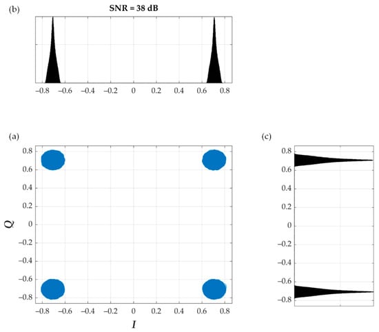 (a) Constellation, (b) in-phase and (c) quadrature histogram for SNR = 38 dB, K = 30, random Am, and EVM = 3%.