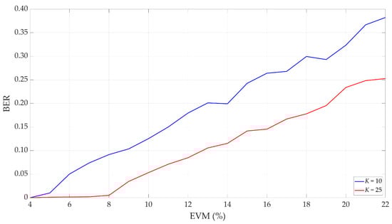 BER versus SNR for different K, random Am, and error vector magnitude (EVM) = 3%.