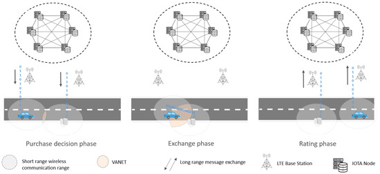 Despite the potentials for sharing data in open systems for smart cities (e.g., setting up ad hoc environmental zones based on vehicle emissions), unique economic and technical challenges hinder the operation of viable open data sharing systems for X-Nodes. Economic challenges relate to the design of an incentive mechanism that should sufficiently motivate X-Node controllers (e.g., RSU owners or vehicle drivers) to share data related to their X-Node. To address this challenge, existing research recommends integrating a payment service into a data sharing system and switching from free data sharing to data trading in VANETs [5,6]. Payments for data should, at a minimum, cover X-Node operating costs for sharing data (e.g., electric power consumption and hardware costs) [7] and should further incentivize the participation of X-Node controllers in data trading (e.g., to compensate confidentiality concerns). Several studies estimate a reasonable price for data sets to be traded between X-Nodes at a few micro-cents [8,9]. The low value of data sets to be exchanged between X-Nodes is mostly below the transaction fees charged by most traditional payment services. For example, the minimum transaction fees using VISA payments often vary between 0.1€ and 0.21€ [10]. The high transaction fees render data trading in open systems via V2X communication uneconomical and, thus, hinder the use of open data trading [11,12].