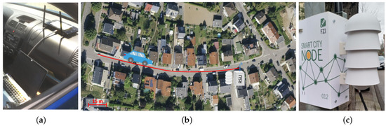 The scenario setup for the viability assessment including the car (a), the road driven with the car during the viability assessment (b), and the RSU mounted along the road (c).