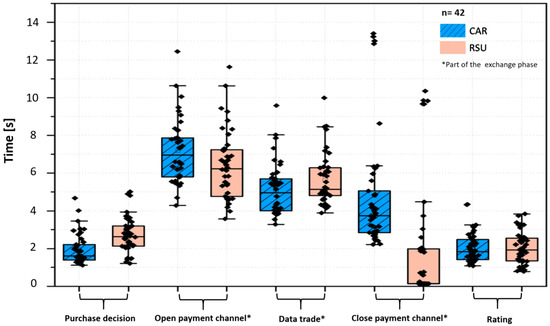 We individually measured all three sub-phases (i.e., open payment channel, data trade, and close payment channel) in the exchange phase. We started the measurements for the open payment channel sub-phase directly after the purchase decision phase and stopped them after the car submitted its bundle to the IOTA network. We calculated a median time for the open payment channel sub-phase of 6.9 s for the car and 6.2 s for the RSU (see Figure 3). The mean times differ primarily because only the car used an FPGA board to accelerate the PoW operations. The RSU did not perform PoW operations in this phase. The median time in the open payment channel sub-phase (see Figure 3) is the highest of all (sub-)phases. The open payment channel sub-phase is time-consuming, primarily because of the PoW operations and a high number of CAMs exchanged to outsource PoW operations from the RSU to the vehicle.