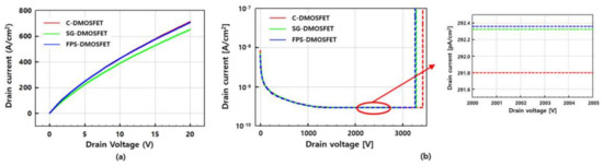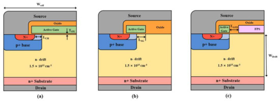 where KA is a coefficient accounting for the current spreading from the accumulation layer to the JFET region, WCELL is the cell pitch, μnA is the electron mobility of the accumulation layer, VGS is the biased gate voltage, and VTH is the threshold voltage. In Equation (5), ρJFET is the conductivity of the JFET region, and W0 is the zero-bias depletion width formed by the junction between the p-base and n-drift under the gate. According to the above equations, a shorter LSG results in a shorter accumulation-layer length, implying a decrease in RA,SP. However, this causes a larger increase in RJFET,SP and a resultant increase in RON,SP. In addition, in the off state (Figure 7b), the leakage current of the FPS-DMOSFET is the largest and the C-DMOSFET is the smallest. This is because the voltage applied to the body diode composed of p+ base and n−drift increases as the active gate length decreases. However, since the leakage currents of the three structures are almost the same, the overall characteristics are not significantly affected.