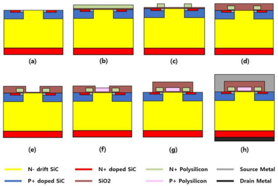 Figure 2 shows the proposed fabrication procedure of the FPS-DMOSFET. First, the p+ base and n+ source regions are formed by ion implantation. Next, thermal oxidation and n+ polysilicon deposition are performed, as shown in Figure 2b. Then, n+ polysilicon is etched using reactive-ion etching (RIE) to form a split active gate. Subsequently, an interlayer dielectric oxide (ILD) is deposited through low-pressure chemical vapor deposition (LPCVD), which forms a relatively low defect density [16,17]. Next, the ILD is etched to form space for FPS. The thickness of the side oxide between the active gate and FPS (TS,OX) is one of the most important parameters in FPS-DMOSFETs, which affects both static and dynamic characteristics. Therefore, in this ILD etching process, TS,OX is determined by the alignment of the ILD etching process. Accordingly, the oxide between the FPS and n-drift is formed with a thickness of 50 nm through thermal oxidation. Next, p+ polysilicon is deposited by LPCVD and etch-back [18,19]. ILD is deposited through LPCVD again. Finally, the source and drain electrodes are formed.