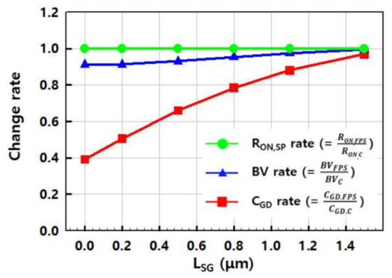 Figure 3 shows the change rate of RON,SP, BV, and CGD according to LSG. To simultaneously analyze the effect of LSG on device characteristics, the RON,SP, BV, and CGD of the FPS-DMOSFET were compared by dividing them by the corresponding values for the C-DMOSFET. First, as shown in Figure 3, the FPS-DMOSFET does not increase RON,SP even if LSG decreases, unlike the SG-DMOSFET, because the FPS forms an accumulation layer in the on state. This allows the FPS-MOSFET to significantly improve the trade-off relationship between BFOM and HF-FOM. On the other hand, a decrease in LSG affects BV and CGD. Figure 3 shows that a reduction of LSG slightly decreases BV while causing a significant improvement in CGD. Therefore, considering both BFOM and HF-FOM, the best performance of the FPS-DMOSFET can be obtained when LSG is set to 0 μm. Although it is difficult to achieve precise alignment in the fabrication process, we assumed it to be the ideal case in the simulation. In addition, as the FPS-DMOSFET is proposed for high-frequency applications, optimization has been performed with a focus on reducing CGD.