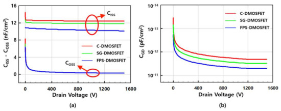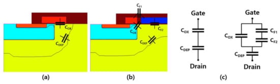 In contrast, the CGD of the FPS-DMOSFET has additional capacitance factors originating from the FPS, active gate, and n-drift, as shown in Figure 5b [20]. Therefore, the total CGD of the FPS-DMOSFET can be expressed as follows: