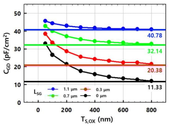 Figure 6 shows the CGD change of the FPS-DMOSFET according to variations in LSG and TS,OX. The straight lines of each color show the CGD of the SG-DMOSFET, which has a different LSG. The total CGD of the FPS-DMOSFET decreases with increasing TS,OX and then gradually saturates to a similar level to that of SG-DMOSFET. This result is consistent with the capacitance model of FPS-DMOSFET established in Figure 5. Therefore, TS,OX must be increased to minimize CF. However, increasing TS,OX decreases BV because the drain–voltage dispersion effect of the FPS is reduced in the off state. Therefore, TS,OX should be optimized to enhance the performance of the FPS-DMOSFET. In Figure 6, CGD begins to gradually saturate to a level similar to that of SG-DMOSFET for all LSG values from the point where TS,OX is 250 nm. Therefore, the optimized TS,OX of the FPS-DMOSFET is set to 250 nm.