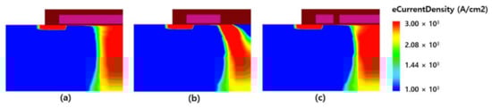 Electron current density of (a) C-DMOSFET (conventional planar DMOSFET); (b) SG-DMOSFET (split-gate DMOSFET); and (c) FPS-DMOSFET (floating p+ polysilicon DMOSFET) in the on state (VGS = 20 V, VDS = 20 V).