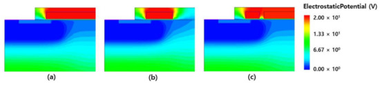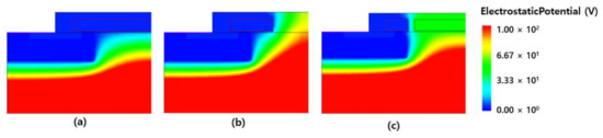 Figure 8 shows the electron current densities of the three structures with VGS and VDS set to 20 V. In Figure 8a, the accumulation layer is formed on the entire JFET region owing to the active gate of the C-DMOSFET. On the other hand, in Figure 8b, the accumulation layer breaks in the middle of the JFET because no active gate exists in the middle of the JFET region. As previously mentioned, it leads to an increase in RON,SP due to the increase in RJFET,SP. Therefore, the SG-DMOSFET, which has a shorter LSG, has a 14% larger RON,SP compared with the C-DMOSFET. However, as shown in Figure 8c, the FPS-DMOSFET shows the same transformation of the accumulation layer as the C-DMOSFET, despite having a smaller LSG than those of the C-DMOSFET and SG-DMOSFET. This is because FPS, which has a high electrostatic potential, forms an accumulation layer over the entire JFET region. In addition, Figure 9 shows the electrostatic potential of the three structures with VGS and VDS set to 20 V. Figure 9b shows that the SG-DMOSFET has a remarkably low electrostatic potential in the region where the active gate does not exist. However, as shown in Figure 9c, the electrostatic potential of the FPS is very close to that of the active gate; therefore, the FPS-DMOSFET shows a similar performance as the C-DMOSFET in the on state. In the off state, the p+ base junction is the main region that sustains the high drain voltage before avalanche breakdown. Furthermore, this cause of breakdown is strengthened as LSG decreases, leading to premature p+ base junction breakdown [22]. This is the main cause of the BFOM deterioration in the SG-DMOSFET. Figure 10 shows the electrostatic potential in the off state (VDS = 3000 V, VGS = 0 V). Unlike the SG-DMOSFET (Figure 10b), the FPS-DMOSFET in Figure 10c maintains a relatively low electrostatic potential at the center of the gate structure owing to the FPS. In other words, in the FPS-DMOSFET, the FPS mitigates this effect. Consequently, the concentrated drain voltage across the p + base junction is distributed. Therefore, the optimized FPS-DMOSFET has a BV very close to that of the SG-DMOSFET, although the LSG (=0 μm) is significantly lower than that of the SG-DMOSFET (0.7 μm).