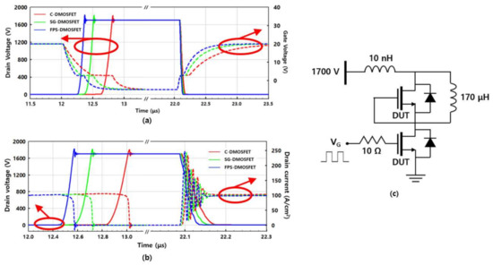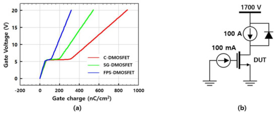 Figure 13a shows the gate charges of the three structures. The test circuit is shown in Figure 13b, and a constant current of 100 mA was used to charge the gate. In addition, a supply voltage of 1700 V and a load current of 100 A were used to charge the gate of the test circuit. The total gate charge (QG) affects the delay time, and it is dependent on CISS. Moreover, QGD determines the switching power loss and it is dependent on CGD. The extracted QGD values for the C-DMOSFET, SG-DMOSFET, and FPS-DMOSFET are 240.2, 131.1, and 102.8 nC/cm2, respectively, while the extracted QG values are 894.1, 545.0, and 419.3 nC/cm2, respectively.