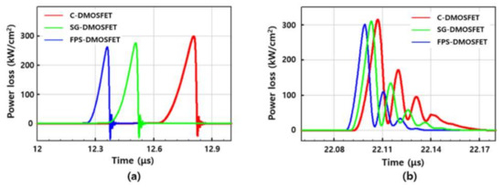 Figure 7 shows the static characteristics, such as BV, RON,SP of the three structures. These results are summarized in Table 2. The on-state characteristics were obtained with VGS and VDS set to 20 V. The C-DMOSFET and FPS-DMOSFET have the same RON,SP of 15.66 mΩ∙cm2, but the SG-DMOSFET has a higher RON,SP of 17.88 mΩ∙cm2. All three structures have the same structure, except for the gate structure. This implies that only the gate structure affects RON,SP. This can be explained through the following equations representing the accumulation-layer resistance (RA,SP) and JFET resistance (RJFET,SP), respectively [21]: