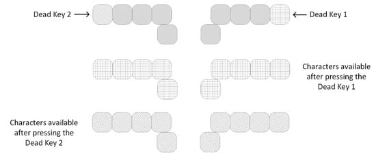 The ORK+ arrangements proposed below is shown on an alternative version of a keyboard arrangement (Figure 3). The presented version of the keyboard layout allows to increase the maximum number of ORK+ keys to twelve. The arrangement shown in Figure 2 limits the maximum number of keys for the ORK+ layout to eleven. In this paper, the authors will focus only on the keys forming the ORK+; therefore, only those keys will be shown in illustrations presenting subsequent arrangements. In the case of the arrangements with 11 letter keys, the keyboard will be extended by one key, located directly to the right side of the key operated by the right-hand little finger. In order to be able to create an ORK+ keyboard with 12 keys, it is necessary to shift (in relation to the one shown in Figure 3) the keys operated by the fingers of the left hand by one to the right. In this case, the little finger of the left hand will be responsible for operating the two keys. An exemplary keyboard arrangement supporting characters available through the use of dead keys is presented as shown in Figure 4. The location and number of dead keys vary from one to another keyboard arrangement.